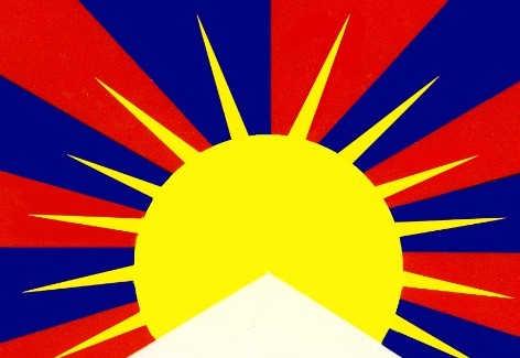 中央の白い三角形は雪山を表し、「雪山に囲まれた地」(カンジョン)として知られるチベットの国を象徴している。 太陽は、チベットの民が自由を平等に享受し、精神的、世俗的な繁栄を手にすることを象徴している。 |
