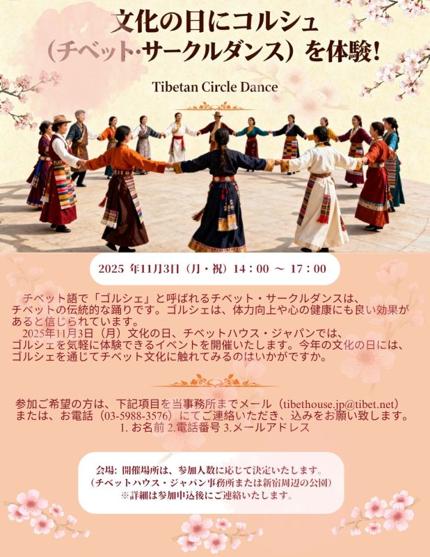 チベット語で「ゴルシェ」と呼ばれるチベット・サークルダンスは、チベットの伝統的な踊りです。ゴルシェは、体力向上や心の健康にも良い効果があると信じられています。 2025年11月3日(月)文化の日、チベットハウス・ジャパンでは、ゴルシェを気軽に体験できるイベントを開催いたします。今年の文化の日には、ゴルシェを通じてチベット文化に触れてみるのはいかがですか。