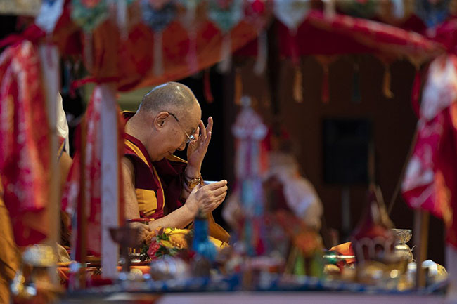 観世音世間自在の灌頂授与に先立って前行修法(準備の儀式)を執り行われるダライ・ラマ法王。