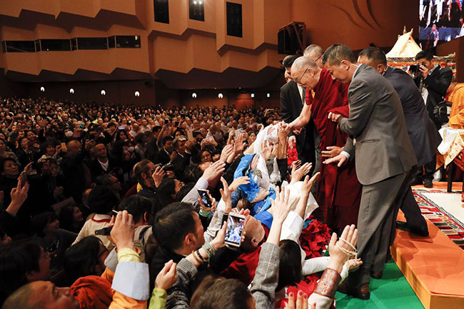 パシフィコ横浜国立大ホールで開催された2日目の法話会が終了し、ステージから降壇されながら会場の参加者との握手に応じられるダライ・ラマ法王。