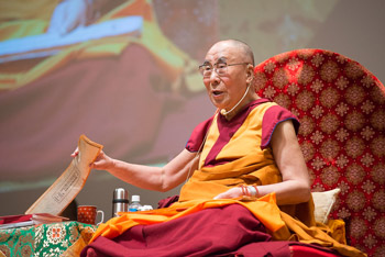 ダライ・ラマ法王をお迎えして大阪市北区の大阪府立国際会議場で開かれている「入菩薩行論・文殊菩薩の許可灌頂」は2016年5月11日、2日目の法話があった。前日に続き、法王はシャンティデーヴァ『入菩薩行論』の第6章までを解説され、各地から集まった多くの聴衆が耳を傾けた。